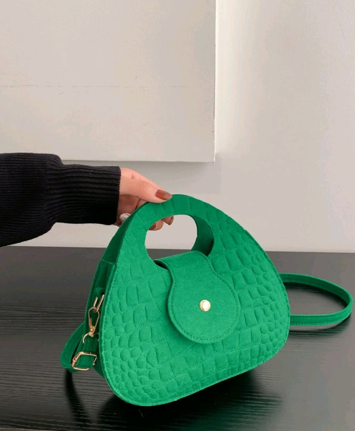Crafted from high-quality faux leather with a suede-style flap and a polished gold-tone button closure, the bag offers both structure and sophistication. The integrated top handle and detachable, adjustable shoulder strap provide multiple styling options—from a sleek hand-carry to a trendy crossbody.