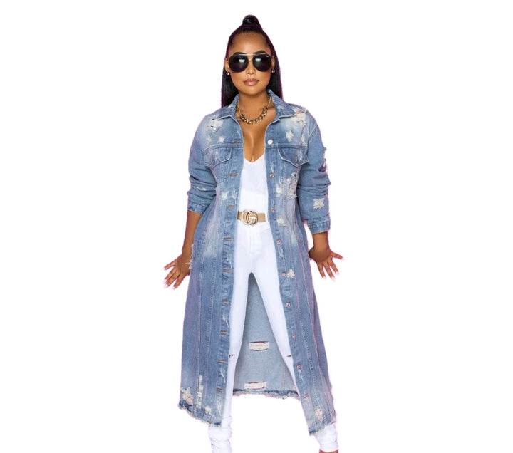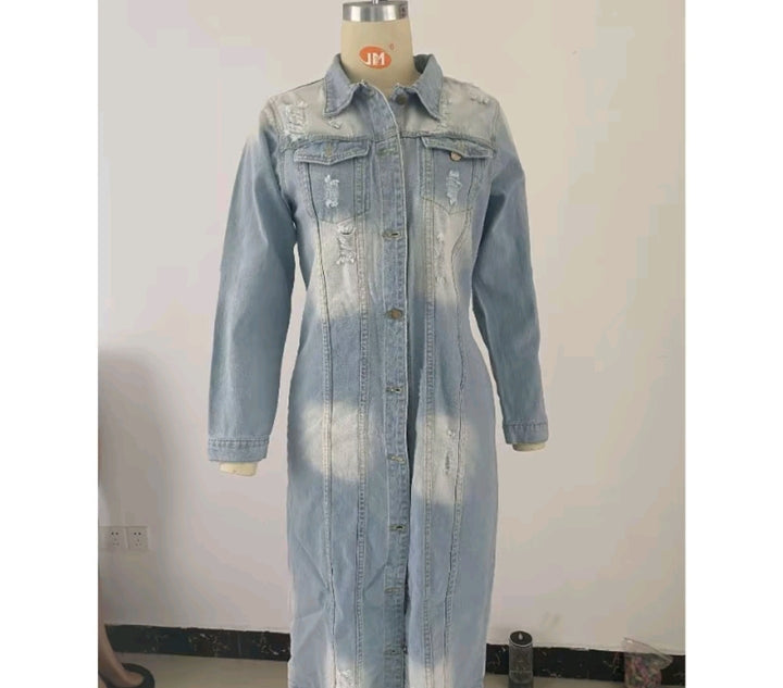 Crafted from durable denim fabric, it offers full sleeve coverage and a straight silhouette that extends to a mid-calf length, making it suitable for layering or wearing as a statement piece. Perfect for casual outings or styled up for a trendy streetwear look.